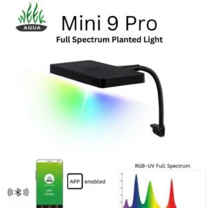 Ưu điểm Đèn Week Mini 9 Pro Thiết kế nhỏ gọn, đẹp mắt và tiện dụng Có Tản nhiệt vật lý: Thích hợp cho cảnh quan vi mô từ 30cm trở xuống Có Quang phổ RGB + UV: Làm nổi bật màu sắc của cá và làm sạch hồ, tạo ra các combo ánh sáng lành mạnh,thúc đẩy quá trình quang hợp cho thực vật.