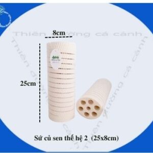 Sứ củ sen thế hệ 2 với kích thước 25x8cm là một vật liệu lọc cao cấp được sản xuất từ chất liệu trơ siêu xốp, tạo ra một bề mặt có diện tích rất lớn để nuôi cấy vi sinh có lợi. Điều này giúp cải thiện hiệu quả lọc nước cho hồ cá cảnh, đặc biệt là với hồ Koi và bể cá rồng.